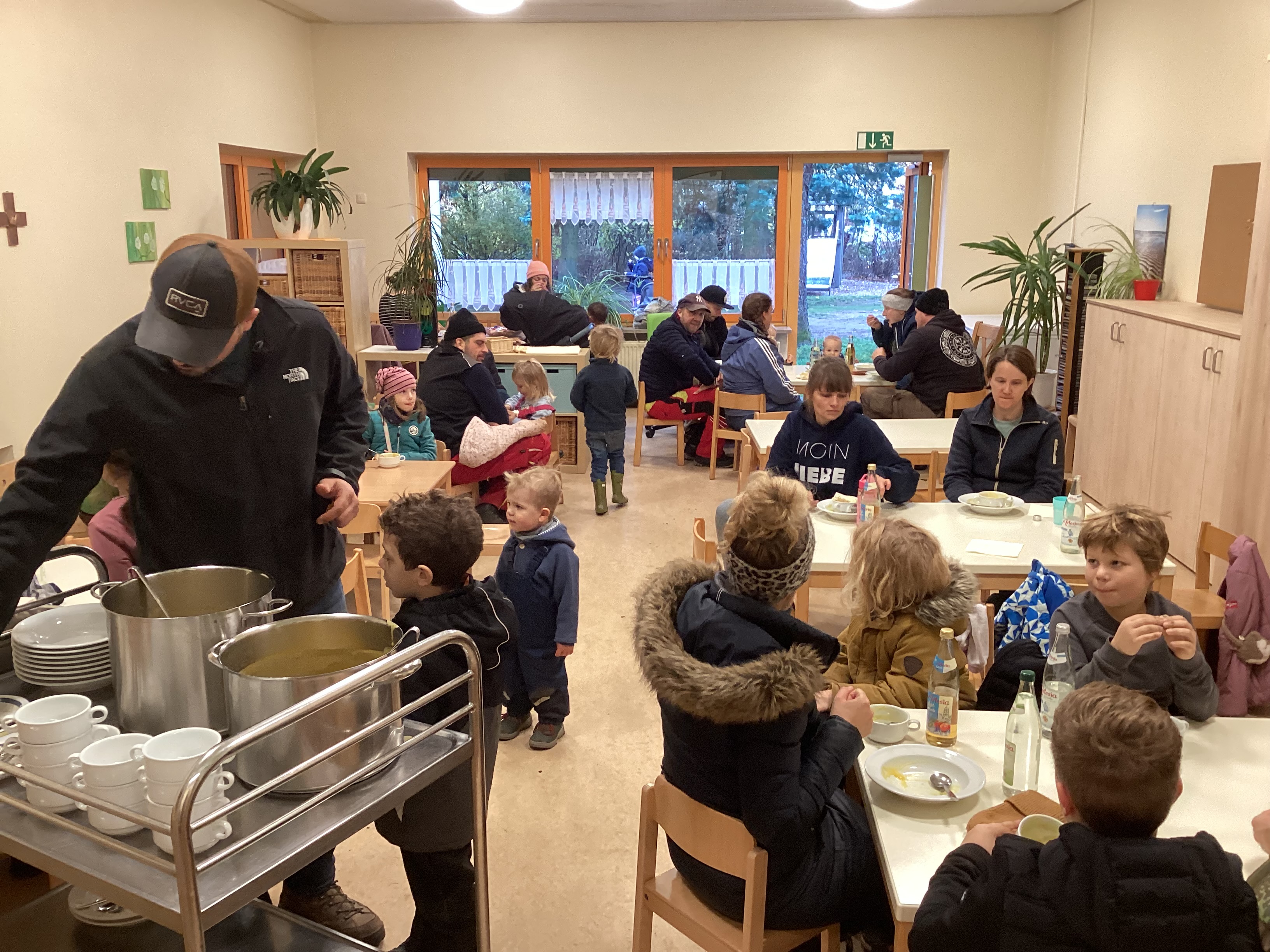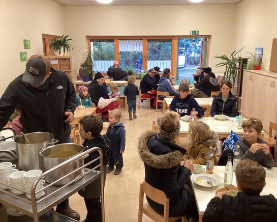 Für das leibliche Wohl sorgte unsere Kita-Köchin Julia, die eine wohltuende, warme Kürbis-Kartoffelsuppe mit knackigen Wienern und frischem Brot zubereitete. Die Getränke standen ebenfalls bereit, sodass sich alle nach der körperlichen Arbeit erfrischen konnten.
