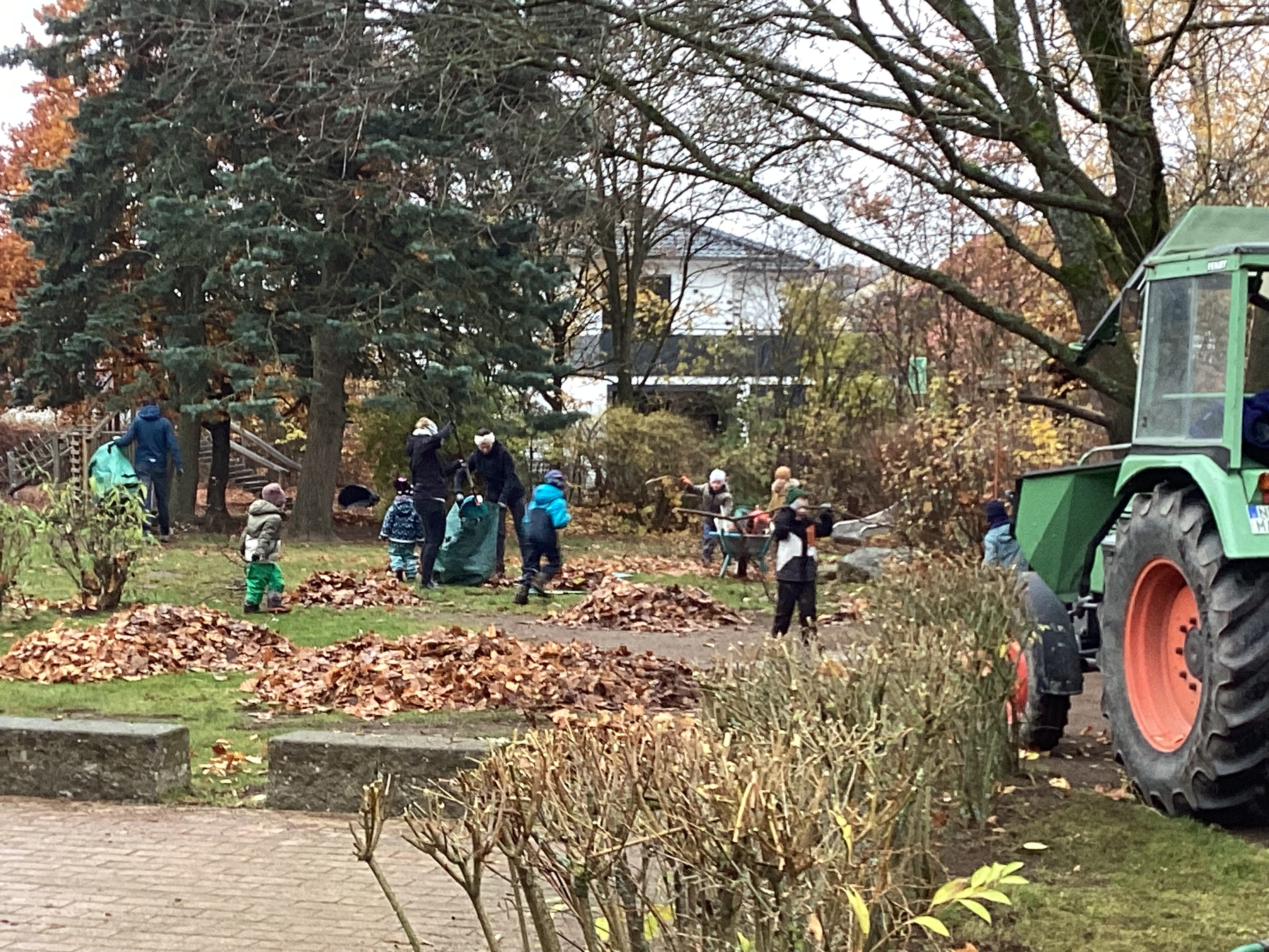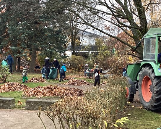 Insgesamt kamen 30 Erwachsene und 27 Kinder zusammen. Die gemeinsame Aktion bot nicht nur die Gelegenheit, den Garten winterfest zu machen, sondern stärkte auch das Gemeinschaftsgefühl aller Beteiligten. Alle anwesenden Familien trugen mit großem Engagement dazu bei, dass der Tag ein voller Erfolg wurde. Im Rahmen des Aktionstags wurden verschiedene Gartenarbeiten gemeinschaftlich durchgeführt. So schnitten die Teilnehmenden sowohl Sträucher als auch Bäume fachgerecht zurück. Das viele Herbstlaub, das sich wie ein „Laub-Meer“ über den Garten ausgebreitet hatte, wurde sorgfältig entfernt. Auch die Sonnensegel wurden abgenommen und für die Winterpause verstaut. Der große Sandbereich wurde zunächst geebnet und anschließend gut abgedeckt, damit er während der kalten Monate geschützt bleibt. Darüber hinaus brachten die Helferinnen und Helfer die Gartenmöbel in Sicherheit, indem sie diese winterfest verstauten. Die Terrassen wurden gründlich gekehrt, und die Spielhallen sorgfältig eingeräumt.