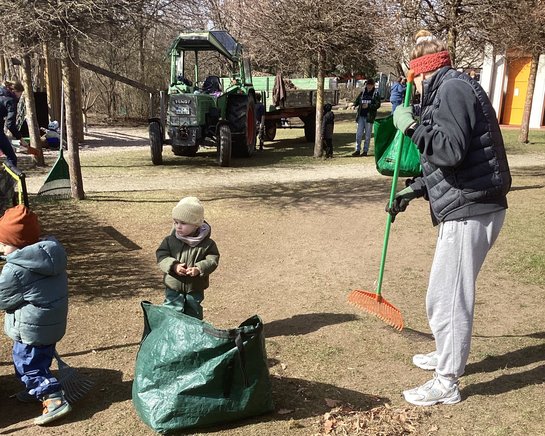 Gut ausgerüstet gingen „Groß und Klein" an die Arbeit: Sonnenschirme wurden aufgestellt, die Sitzmöbel für die Terrassen rausgeholt, Sonnensegel über den Sandbereich gesetzt, Laub von den Grünflächen entfernt, kleinere Reparaturarbeiten ausgeführt, Gartenbeete durchgejätet, der Fußfühlpfad auf Vordermann gebracht und unsere neue Kita-Fahne gehisst…