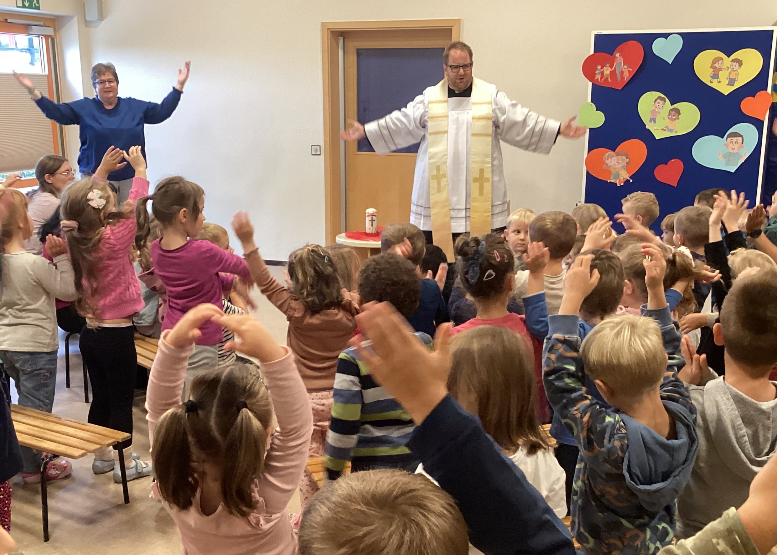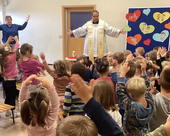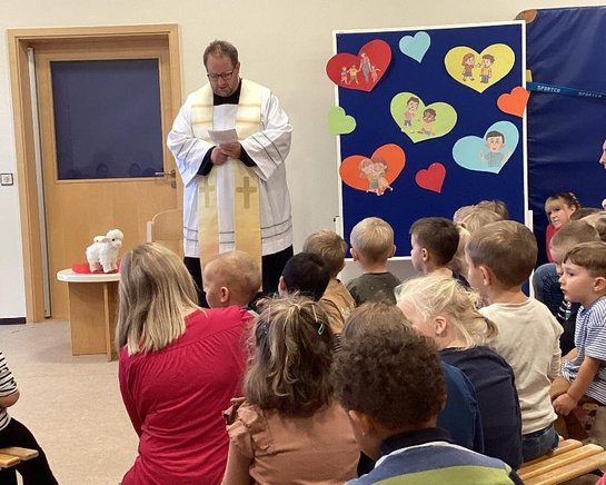 Nach intensiven Tagen des Ankommens und Eingewöhnens, haben sich am 24. September alle Gruppen im Turnraum versammelt, um gemeinsam mit Pfarrer Daniel Fenk das neue Kita-Jahr 2025/ 2026 unter Gottes Segen zu stellen.