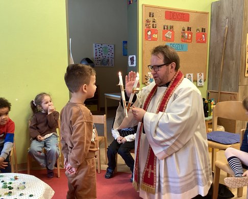 Pfarrer Fenk besuchte alle Kinder der Kita, um ihnen den Blasiussegen zu schenken.